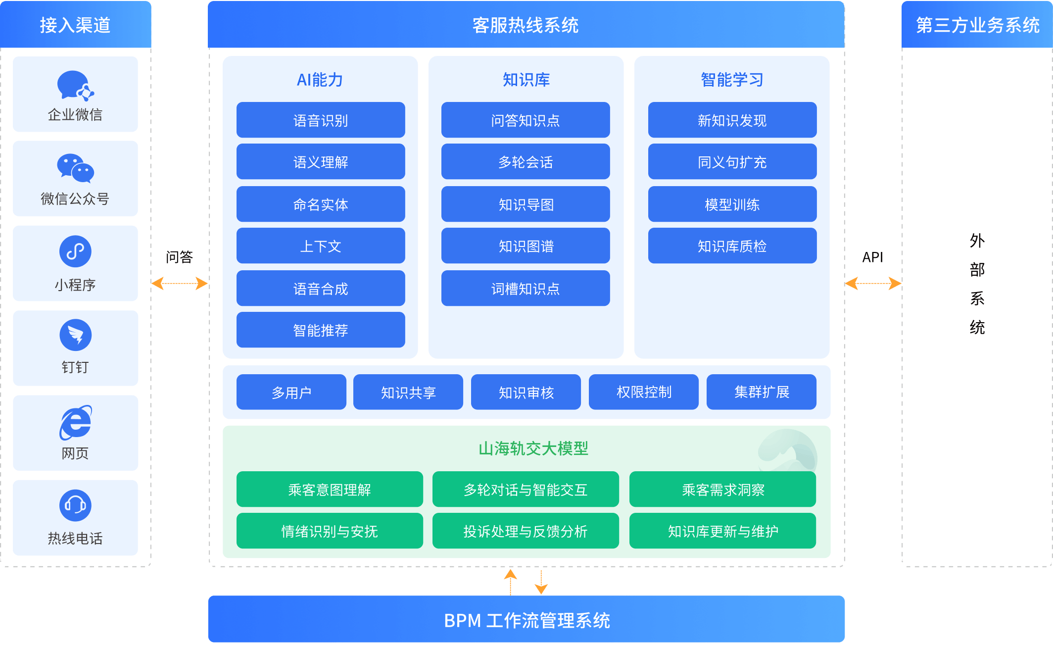 結合智能電話機器人與人工服務,構建“自助、智能、人工”三層服務架構。利用智能機器人IVR進行語音識別和需求分析,配合智能坐席工作台,實現智能問答與人工輔助。對於機器人無法解決的問題,係統自動轉接至人工坐席,旨在優化用戶交互,減輕客服人力負擔,並有效降低運營成本